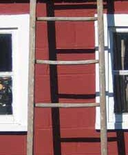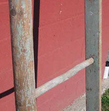 Split pole ladder made from pine with and hand scraped oak rails. Two rails missing but can be replaced. Original paint, light blue. Great for hanging from ceiling as decoration. It measures 22” at base and tapers to the top. It is 12’2” tall.