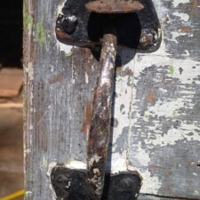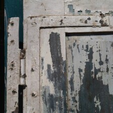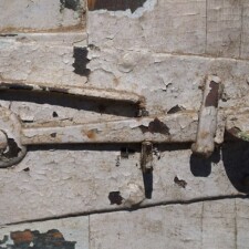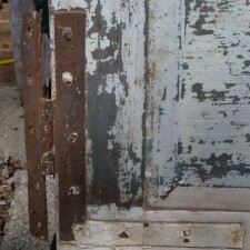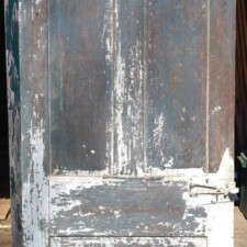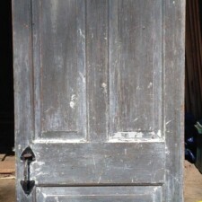 Fantastic 18C., rare 3-panel, right-hand door with the works…a wonderful period blue-gray color and great original hardware. A very handsome door. Wood is all hand planed and about 80% hand scraped with a razor blade to reveal the original color. It has: an original hand forged, through the cusp, spade latch and thumb piece with rose head nails: an original, hand forged spring loaded bar and staple combination (the first I’ve seen in 30 years), with rose head nails; and a pair of original, large hand forged H-L hinges with rose head nails. A very special door. It should have the rest of the white paint carefully removed by lightly scraping and used in a prominent place so it can be seen and admired. It measures 27.5” wide x 74.5” tall x a bit less than 1” thick.