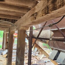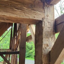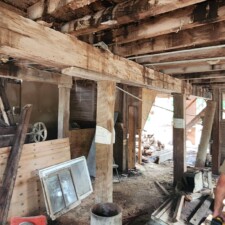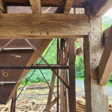 Shamrock Mill was built in 1770 and was located in Paxinos, PA. These two beams flanked the main floor and are original to the 18C mill. The mill only processed grains and the beams were never painted or whitewashed. They are hand hewn and full length from one tree. They have never been exposed to chemicals or animal waste. Material has been visually de-nailed. It would be fabulous material as exposed beams in a house or great room.