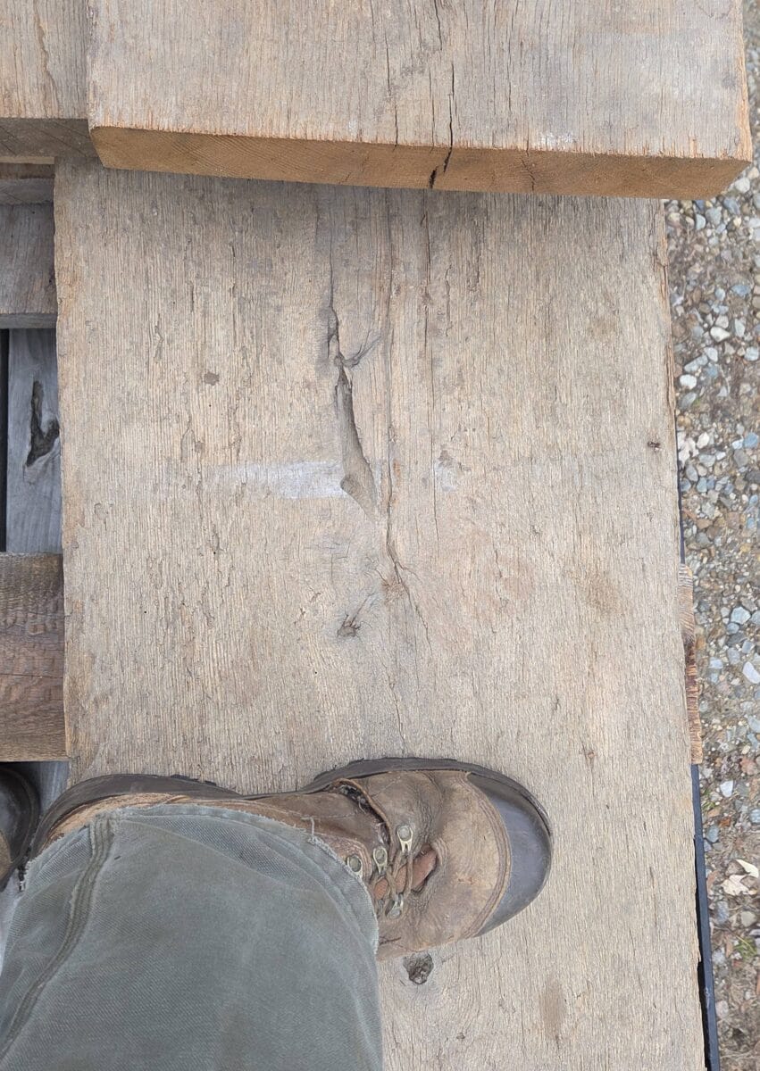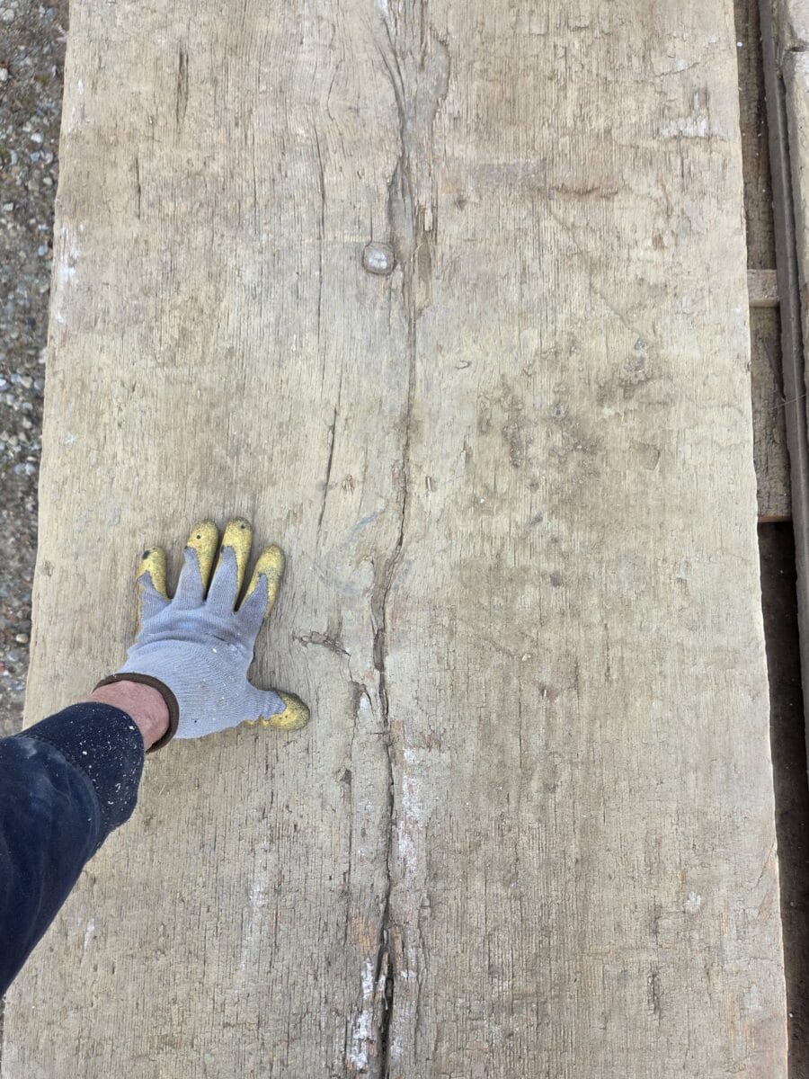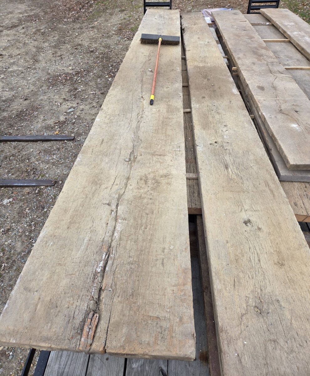 Added November 22, 2025.475sf of extremely wide and thick oak threshing floor. This is another rare find from PA because of its width and condition. All the planks are from the same barn which was salvaged about 30 years ago and found correctly stored in a dry barn last month. Some of the wider planks weigh up to 400 lbs each. About 40% of the material is ~2.5” thick and the rest is ~2” thick. A ½” plywood layer can be used to raise the 2” material. Widths range from ~12” to 24”+ (with more than half the boards being 16”+) and lengths of ~12’ to 17’+ (+ a few shorts). This will be an incredible looking floor if prepared and installed correctly. As with all my original antique material, boards may need to be washed, buffed, trimmed, repaired (patching holes, dealing with areas damaged by water leaks, etc.), carefully puzzled together and installed to create a floor that suits your needs.