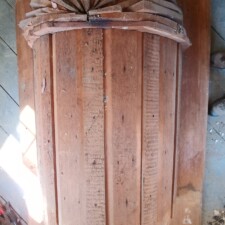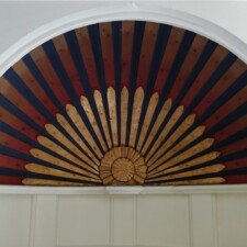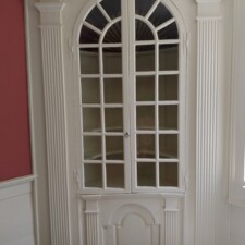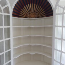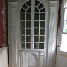This early built-in corner cupboard, c.1735, was recently salvaged from the Van Wyck House parlor in Lloyd Harbor, NY. It was the first house to be built on this harbor and boasted a 500 acre farm and a spectacular view. The piece is in great condition, but the crown molding didn’t survive the extraction and could be custom made from a sample piece I saved. The face measures approximately 58” wide and 7’8” tall and would need to be built into a corner with ample space. The glass doors are original and measure 32” across and are 60” tall. There are 5 shelves with ‘lollypops’ intact, and a beautiful ‘sun burst’ pattern made from curved wood pieces (not plaster). It features a ‘tomb stone’ sliding bottom door. The photos of the back of the cupboard show its high quality wooden construction.